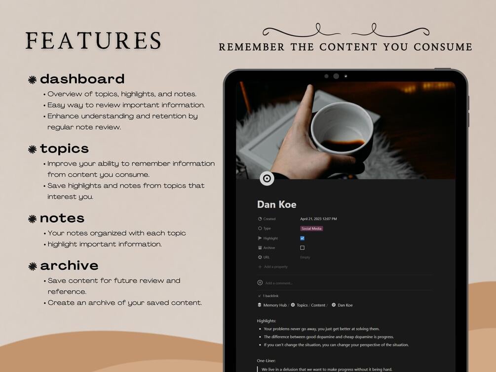 The Memory Hub for Notion is a digital note-taking and topic-saving hub designed to help users stay organized and remember content they consume through adding topics, taking notes, viewing highlights, organizing, and archiving.